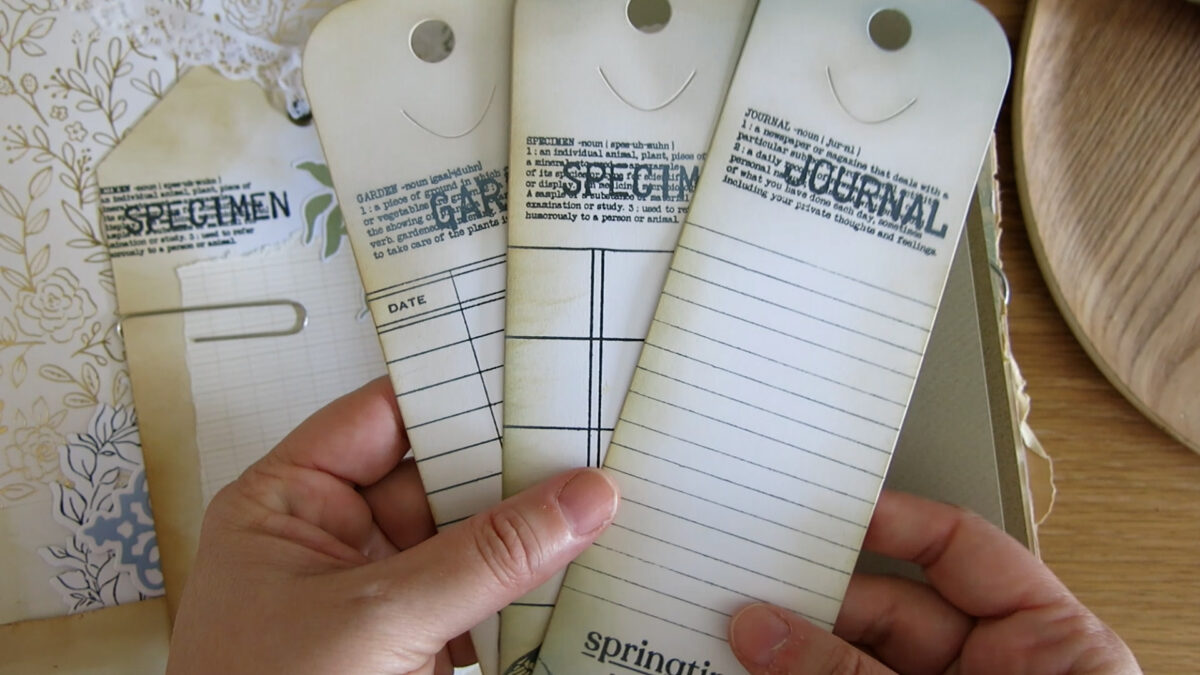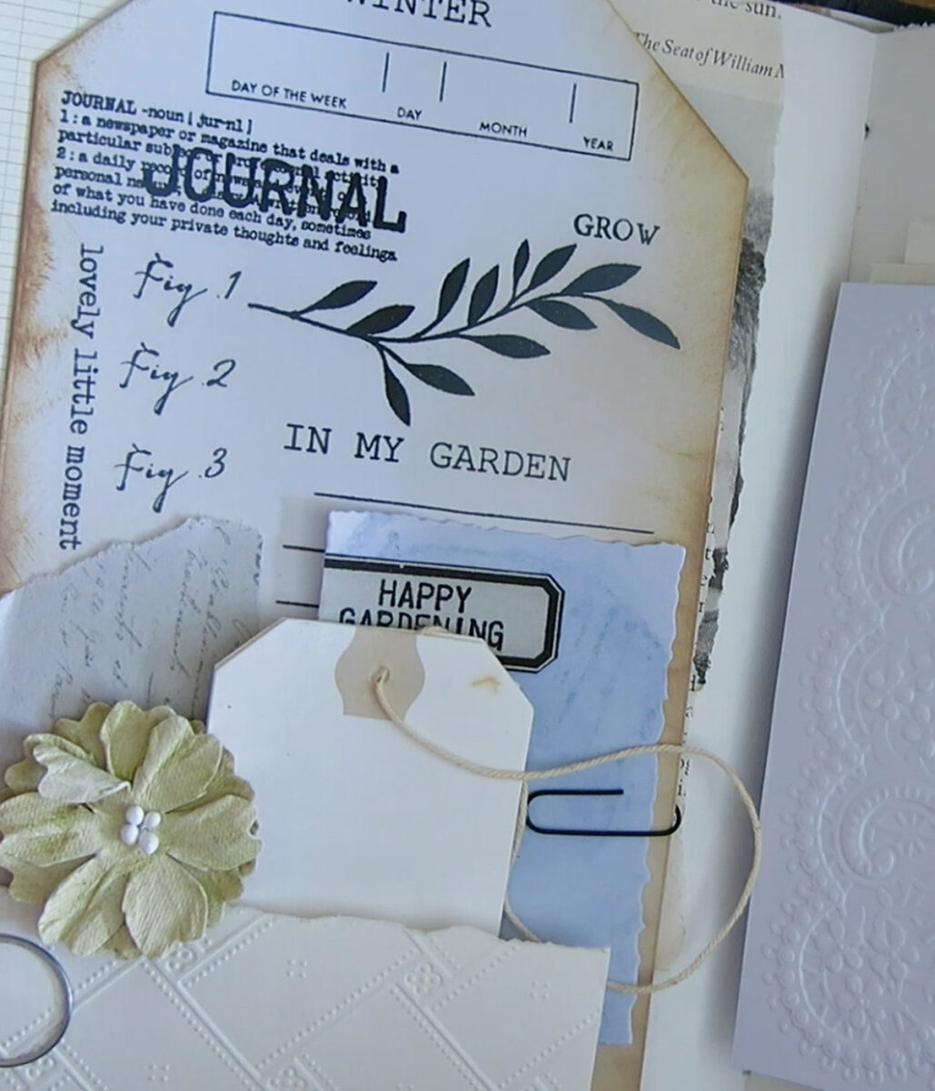 אחרי שהיו לי את כל החיתוכים צבועים, חתוכים ומוכנים להדבקה, עברתי על כולם ומיינתי אותם לשתי קבוצות- קבוצה אחת של אלמנטים שנועדו להיות מונחים ומודבקים בשכבות (נקראים גם: Clusters) וקבוצה אחת של אלמנטים שנועדים להיות מוחתמים בחותמות ייעודיות לגינה מהאוסף האישי שלי. התהליך עצמו ארך כמה שעות טובות אבל בסופו הגעתי למגוון של חיתוכים יפים שהתלוו בצורה אקלקטית לנושא הספר. חותמות רבות עסקו בנושא גינה, כתיבה ותיעוד והשתלבו יפה עם התמה של הספר עצמו.