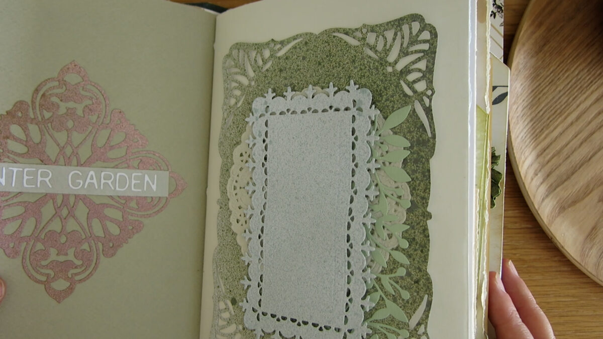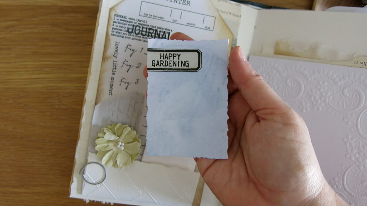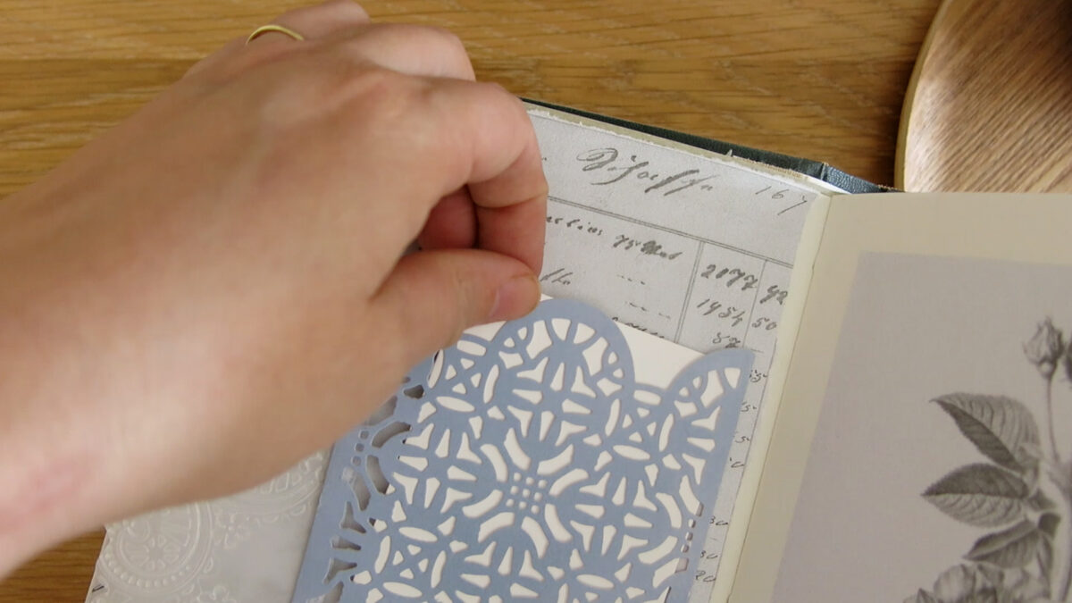 השארתי ניירות רבים ריקים, כדי שיהיה לחברתי מקום לכתוב, להדביק תמונות ולשמור זכרונות (פרחים, זרעים, עלים וכו') באופן שלא יעמיס על השלד של הספר ובכך יקשה עליה לכתוב בו ולהשתמש בו. היה לי חשוב שכל חיתוכי הנייר הקטנים יהיו מאורגנים באופן כזה שיהיה לכל נייר את המקום המושלם שלו, מבלי להתפשר על מקום למלל ולתמונות. ברוב המקרים, בחרתי בצבעים עדינים כמו ורוד עתיק, קרם, ירוק עמוק, אפור ותכלת. דרך נוספת למתן את הנייר היתה באמצעות הבלטות קרות (Embossing) ובצביעת ניירות באמצעות שקיות תה (הדרכה לכך אצלם בקרוב). תמיד העדפתי לבחור ניירות שיש להם טקסטורה עדינה ויפה ונמנעתי מצבעים חזקים או מטקסטורות שתופסות את העין ולוקחות את הפוקוס מהתוכן עצמו.